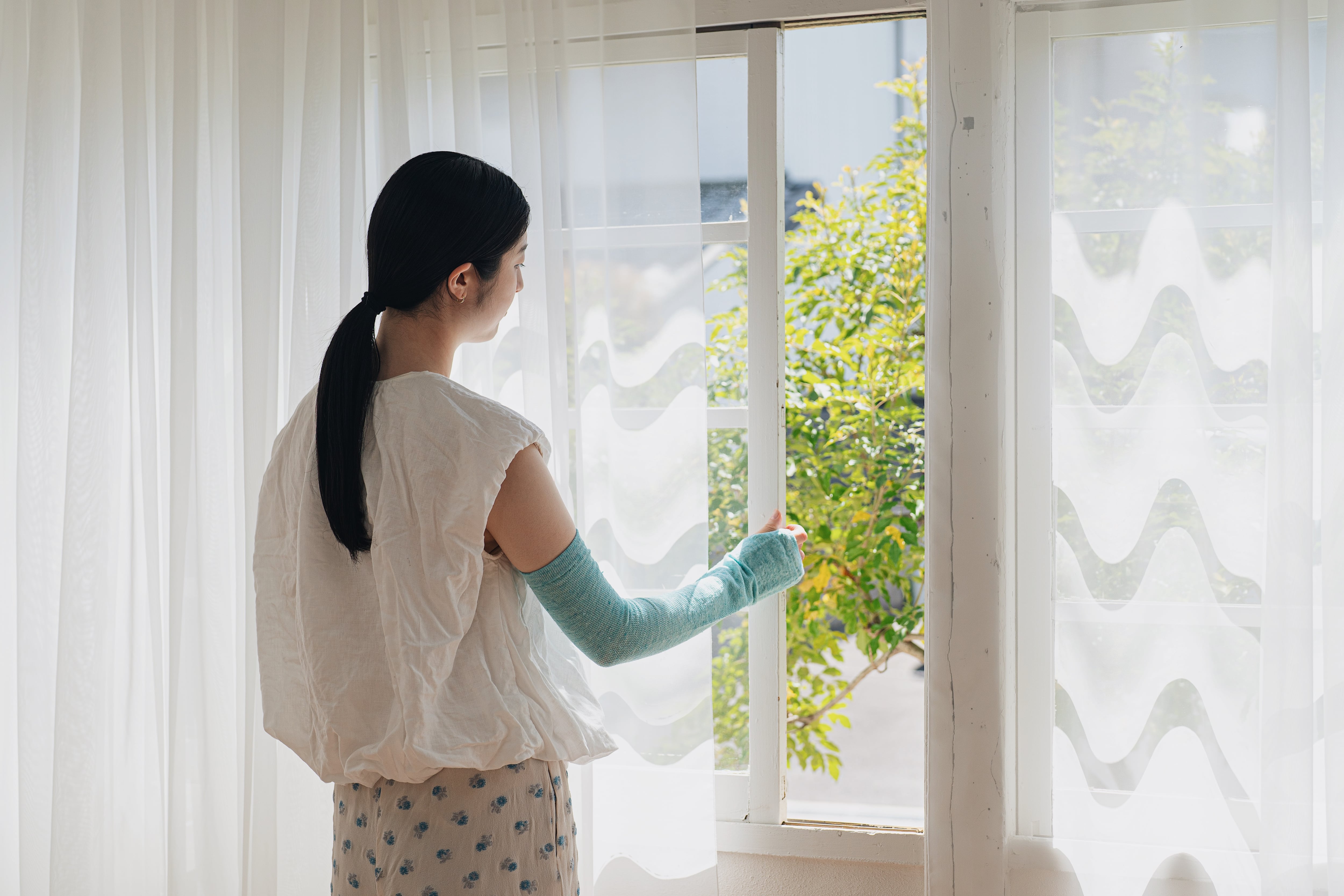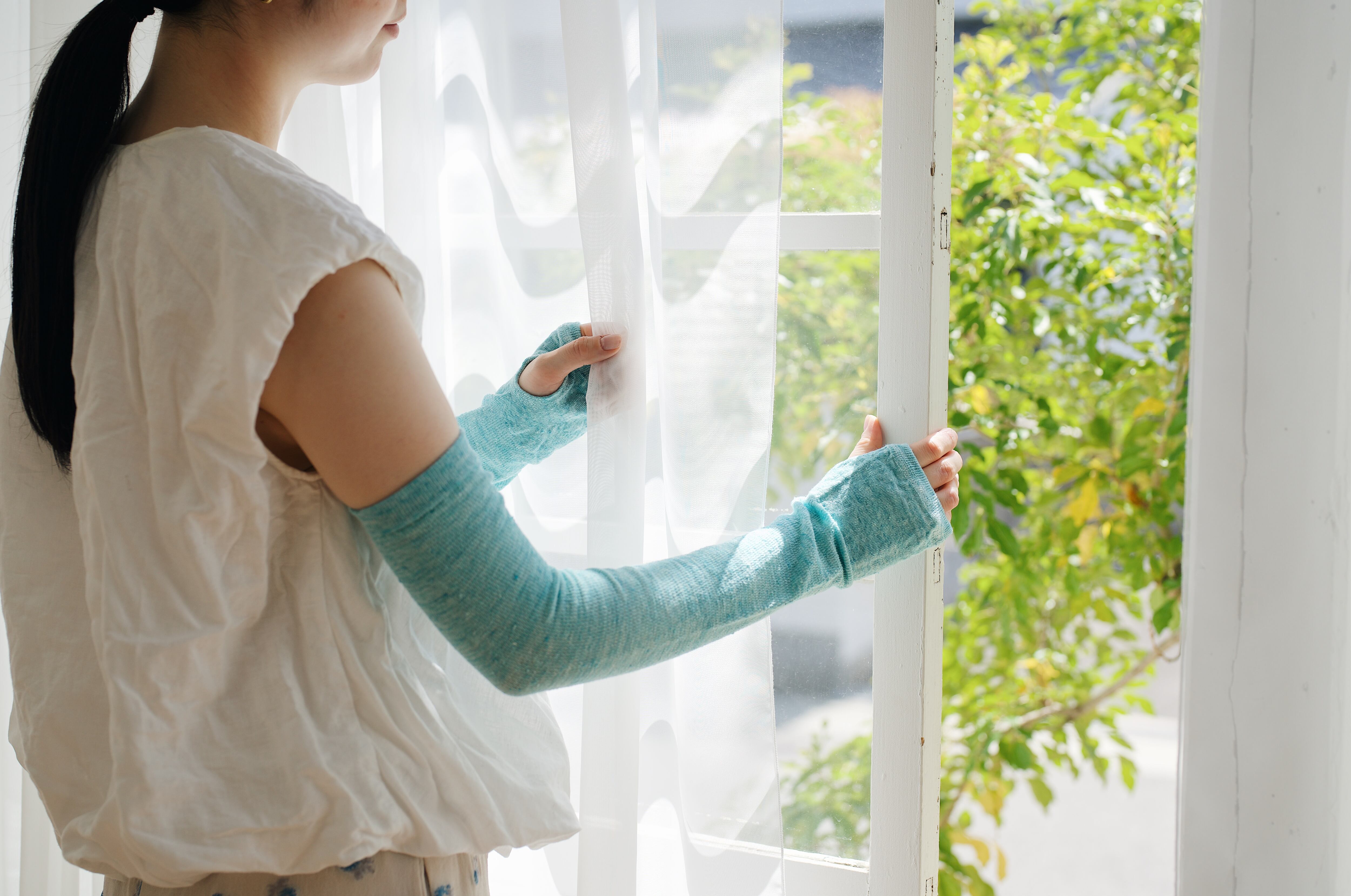 シャリ感と通気性が強いリネンを使用したアームカバー。手を通した瞬間からシャリシャリと心地よく涼しい。